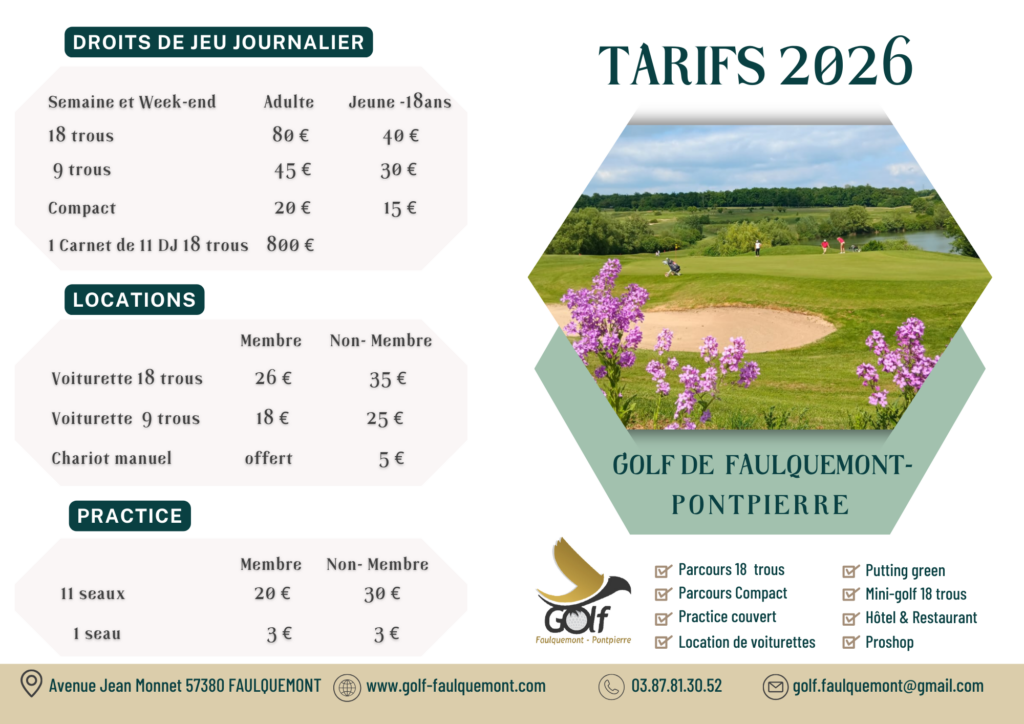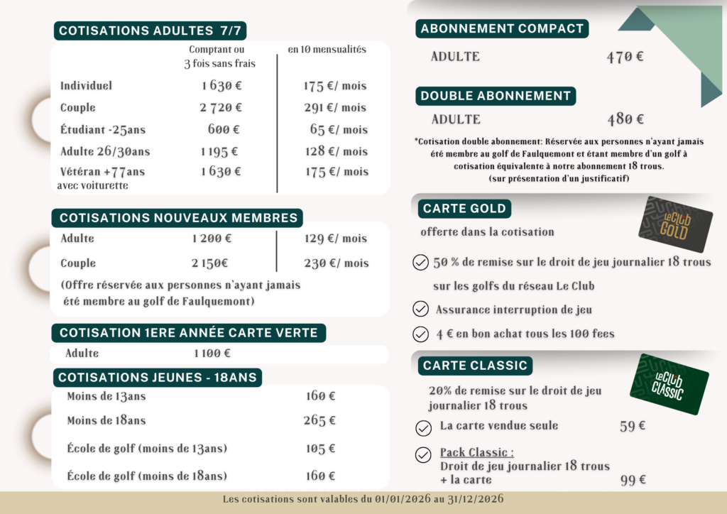 *Cotisation double abonnement: Réservée aux personnes n’ayant jamais été membre au golf de Faulquemont et étant membre d’un golf à cotisation équivalente à notre abonnement 18 trous.