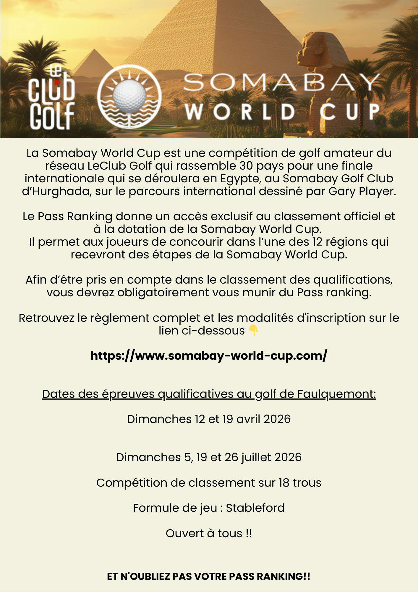 « Tous les Évènements Somabay World Cup & Coupe de Classement 19 avril @ 8 h 00 min - 17 h 00 min UTC+1 « Somabay World Cup & Coupe de Classement Les Voiles de l’Espoir » + Google Agenda+ Exporter vers iCal Détails Date : 19 avril Heure : 8 h 00 min - 17 h 00 min UTC+1 Catégorie d’évènement: compétition Vous aimez cet article ? Partagez le !
